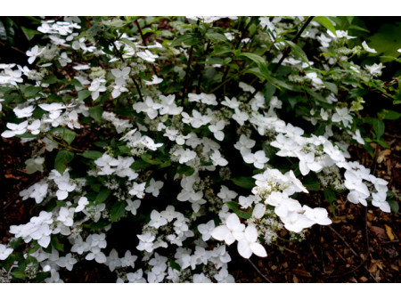 Petit arbuste d'une grande délicatesse, dont les inflorescences plates sont composées de fleurs fertiles rose pâle et de sépales blanc pur, le tout mis en valeur par un feuillage vert foncé légèrement brillant. Une très belle hybridation entre H. serrata et H. luteovenosa.